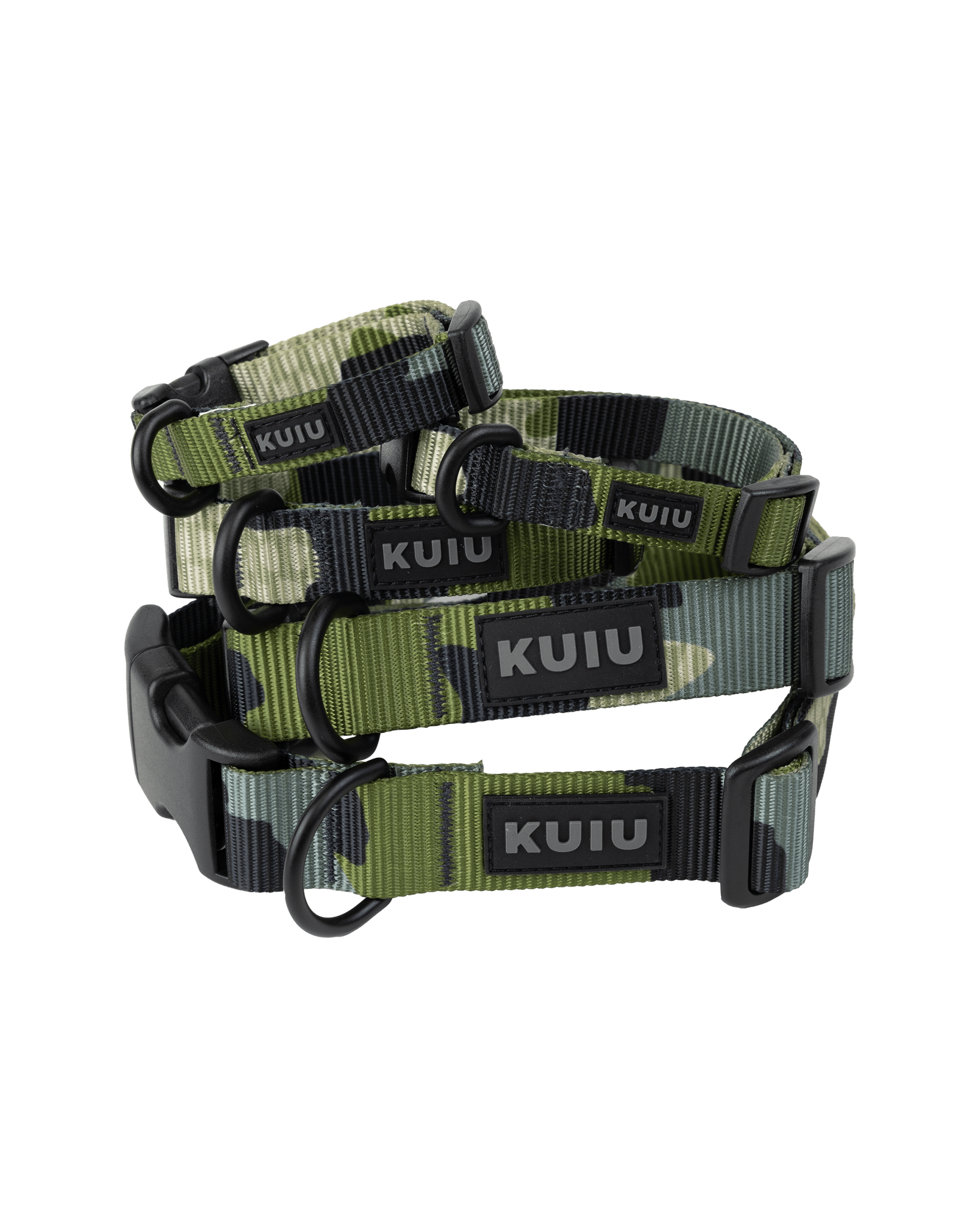 Built from durable nylon webbing. this KUIU?camo dog collar features a side-release buckle for easy on and off and a robust D-ring for leash attachment.?The collar features a durable rubber KUIU logo patch and is offered in our Valo. Verde. and Vias camo patterns. This tri-slide adjustable collar is offered in multiple sizes. simply measure your dog’s neck circumference for the correct size.