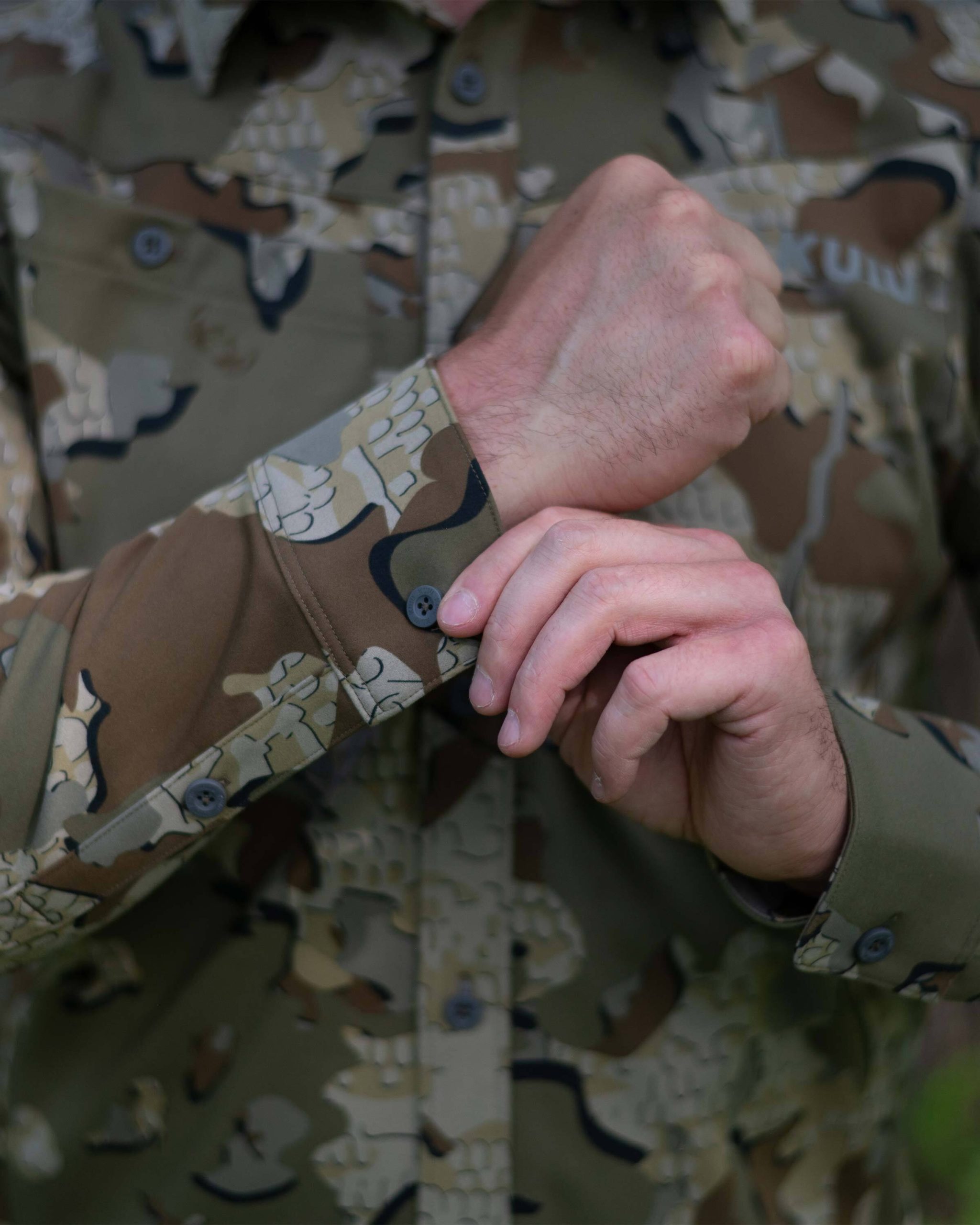 This button-down shirt with folded collar features a zip closure left chest pocket and a button closure right pocket for securing your essentials. An underarm gusset adds comfort while drawing your bow or climbing into the stand and a curved hem for coverage in a tucked or untucked length.