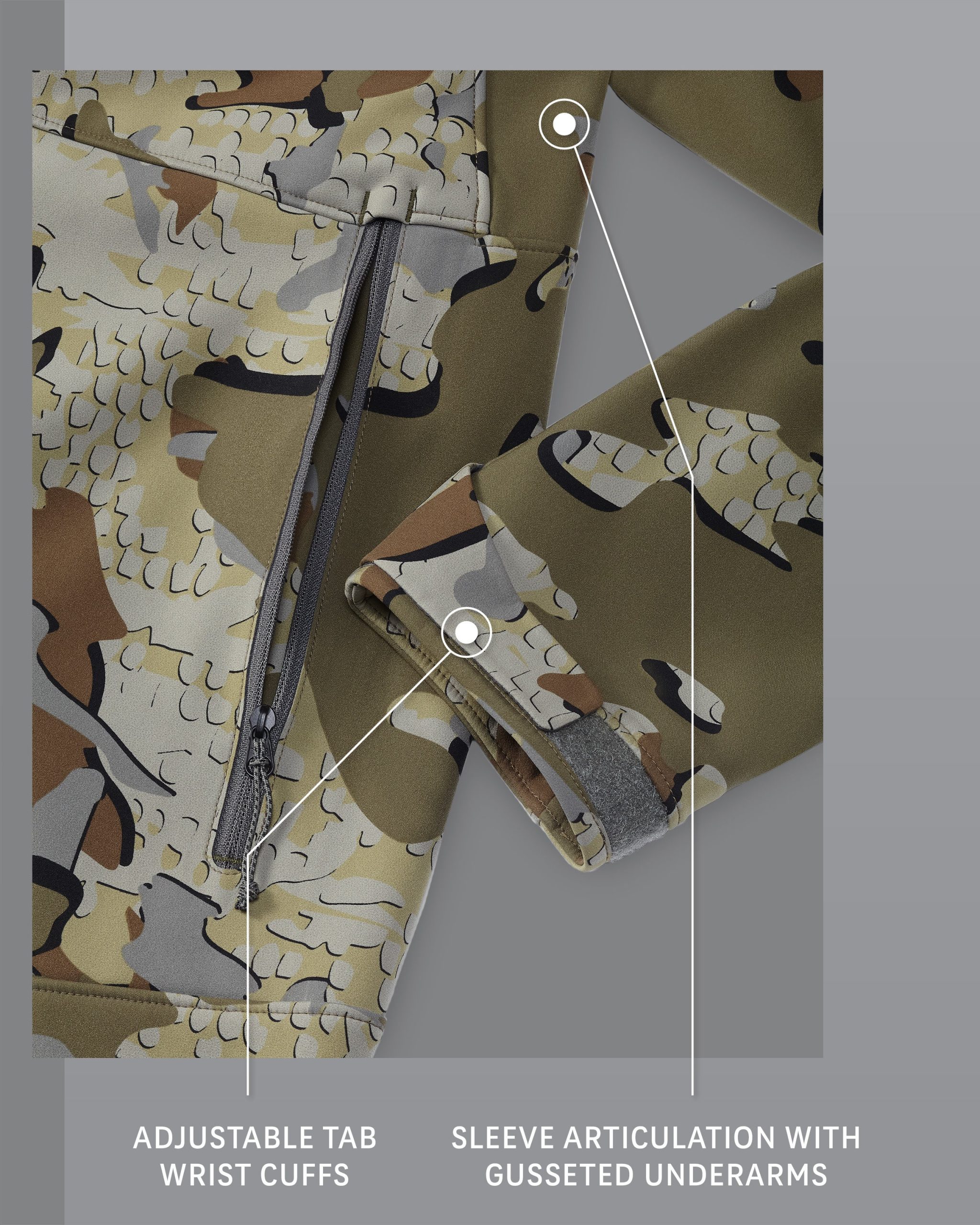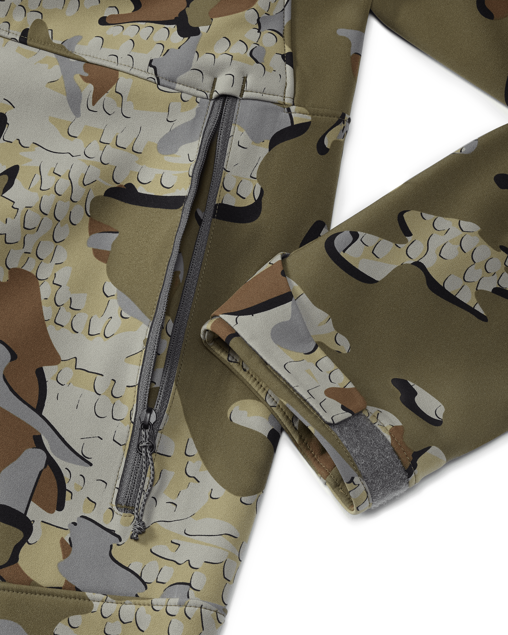 With the mountain hunter in mind. we optimized and fine-tuned every feature. including dual chest pockets with an added accessory lanyard connection point. zippered pit vents for thermoregulation. and a two-way adjustable storm hood that can be cinched back on either side and worn up while shooting. In addition. an adjustable hem cinch blocks out wind. and raised hand pockets stay accessible while wearing a pack.
