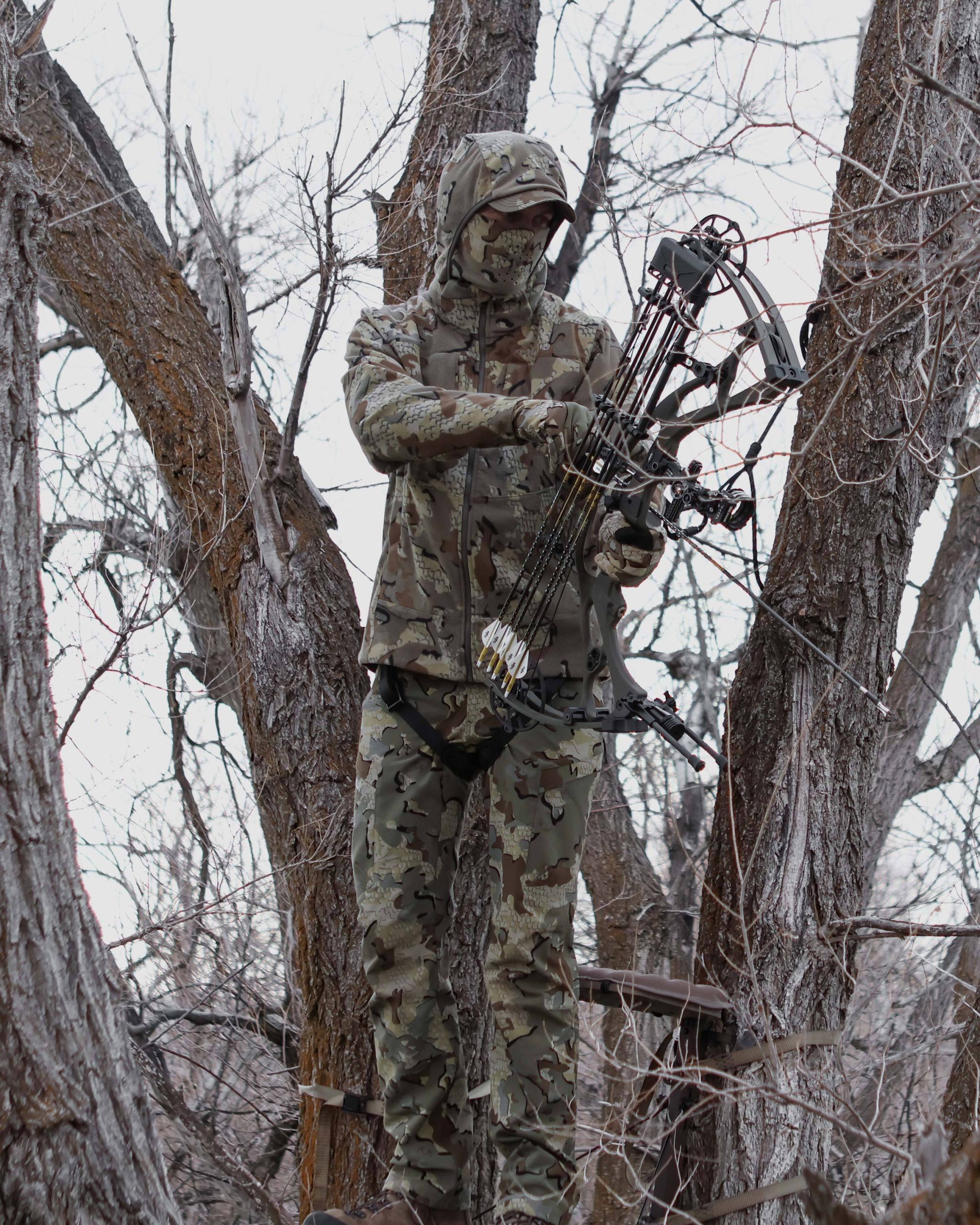 The Proximity LT is a versatile outer-layer windproof shell. uninsulated for ease of layering in mild to cold temperatures with bone-chilling wind. Engineered with purpose-driven features for stand hunting. it includes a patent-pending removable hood. safety harness port. and dual chest pockets with rangefinder connection points. Its articulated design. high-stretch fabric. and streamlined forearms allow you to shoot without interference or restricting mobility.