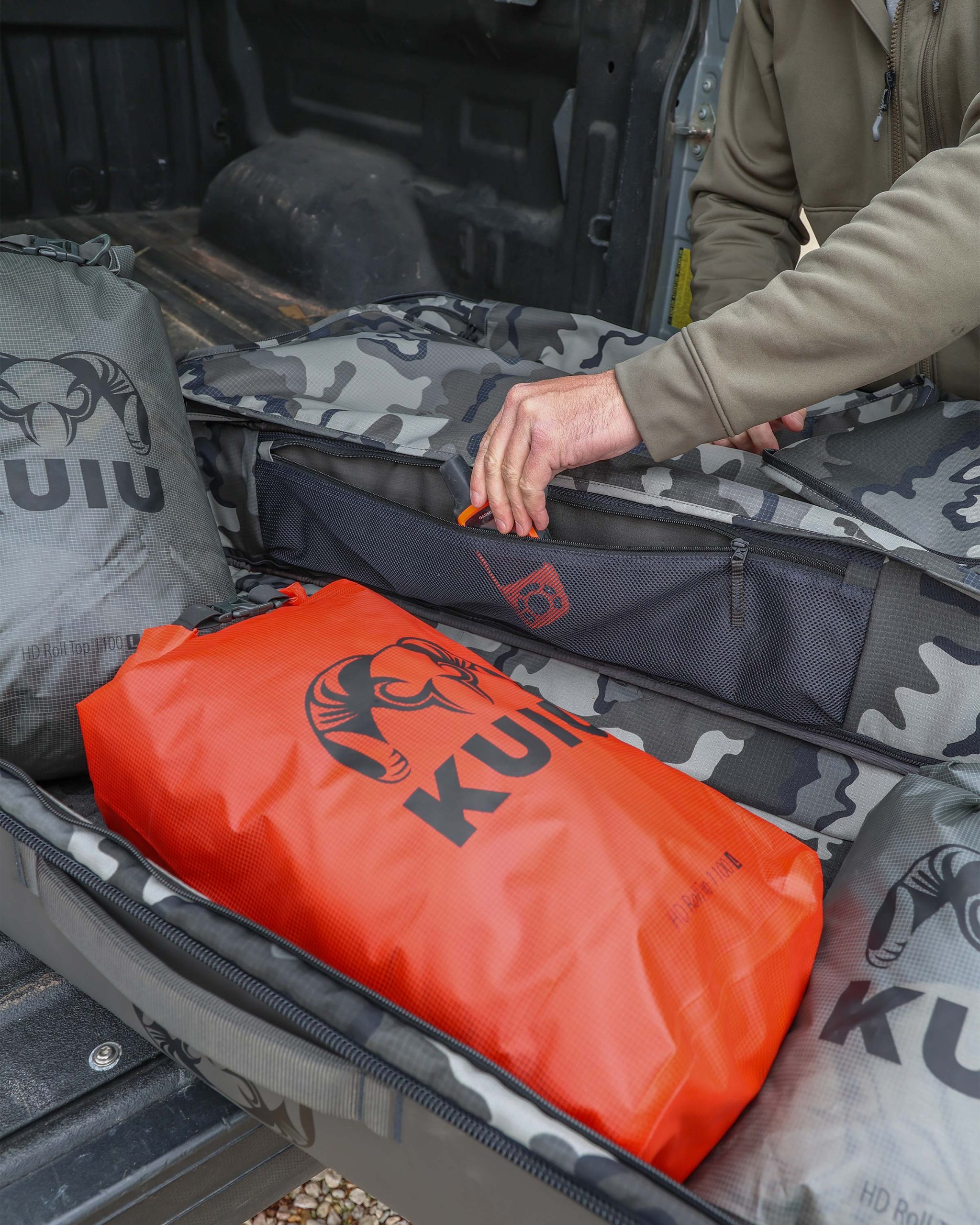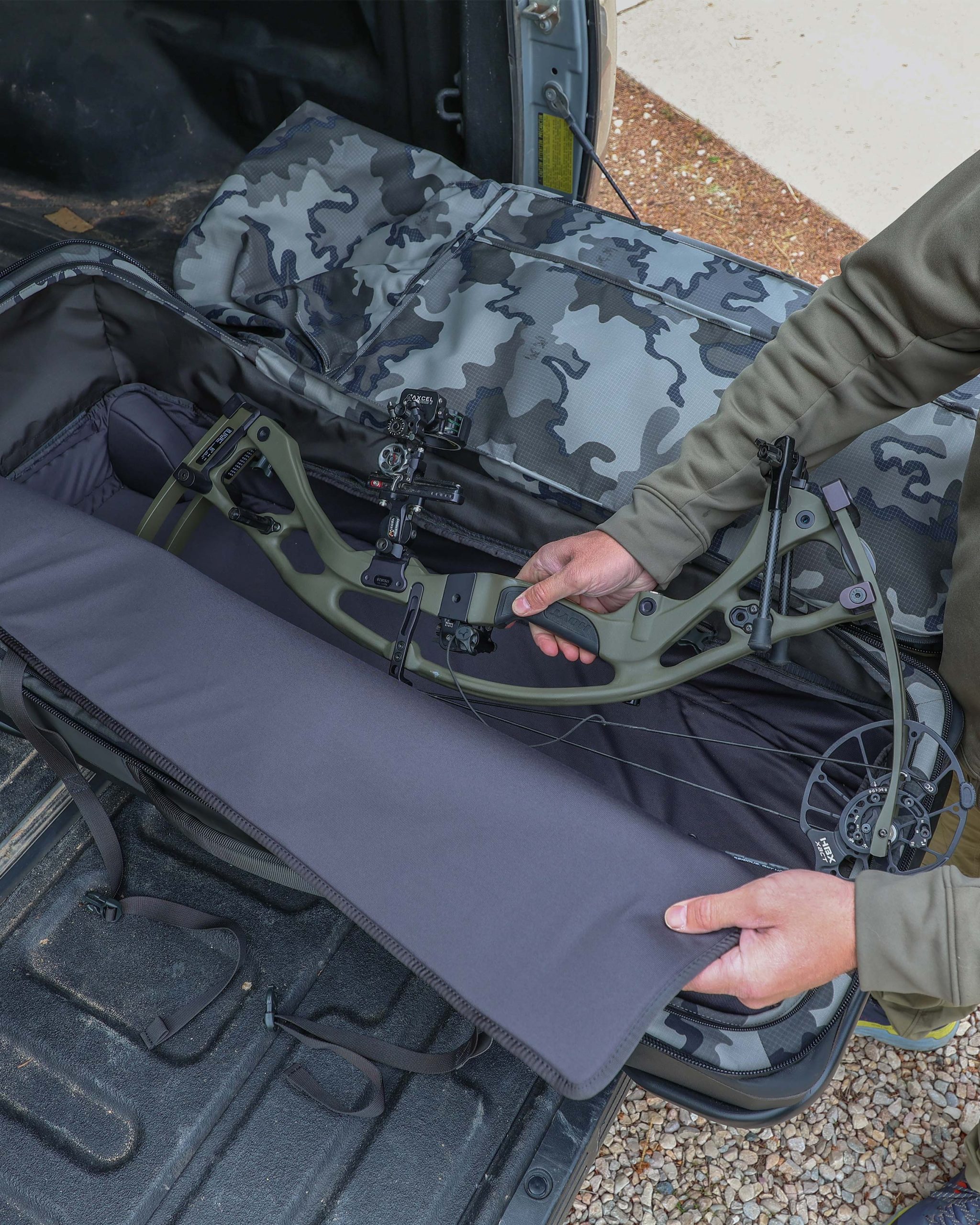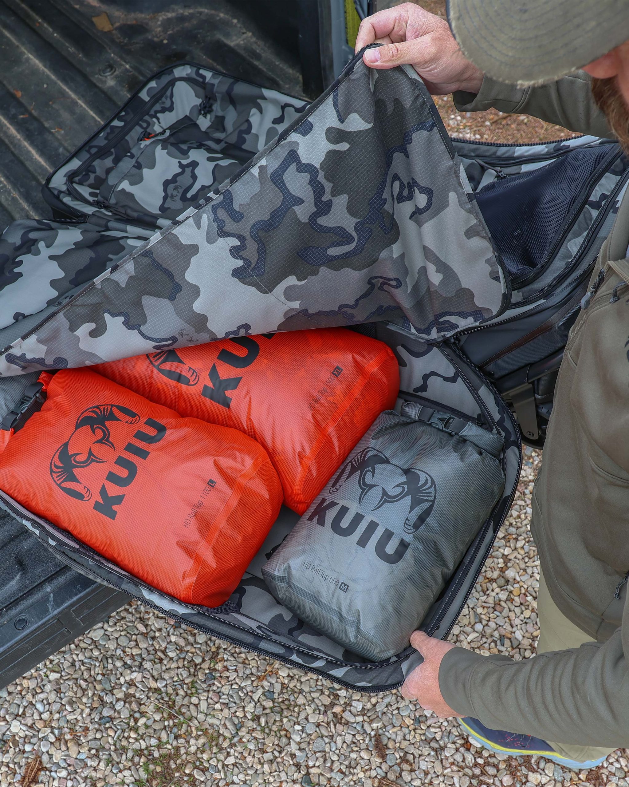 Both main compartments are easily accessed through external zippers. while the internal storage compartments are divided by a partition that keeps your items separate and organized. It features dedicated compartments for a bow. tripod. tent. and boots. with plenty of extra room for clothing. optics. and gear. Additional lid storage is provided with two large internal zipper pockets and an easy access external zipper pocket. The interior is fully padded and lined with 300D DWR coated polyester ripstop fabric with stretch-mesh pocketing and an internal lashing system in the main compartment.
